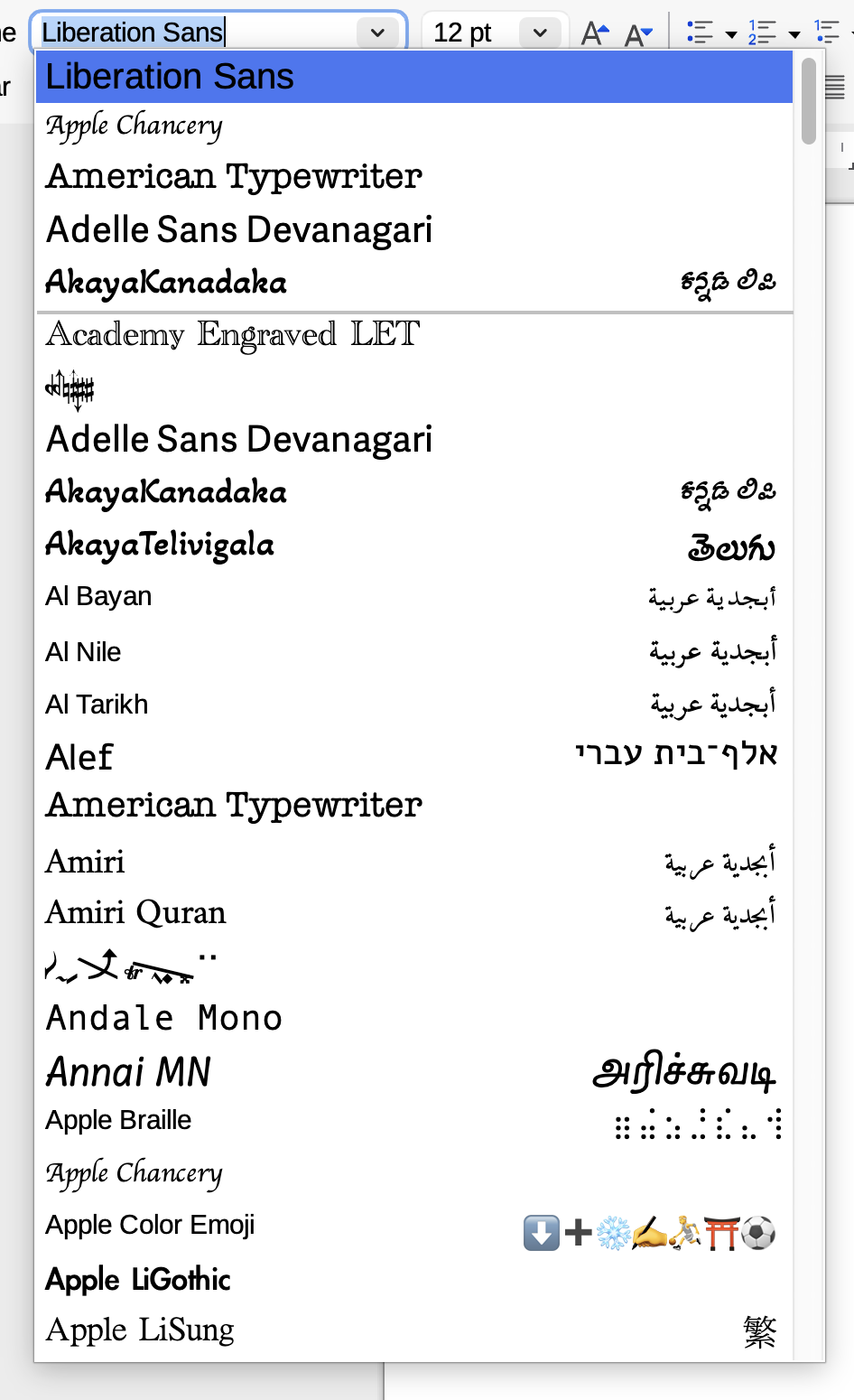 I’m working with a new MacBook. On my previous Mac MINI I was able to import DOCX files into Libre Office Writer without issue. Now, the file is being opened with what appear to be “scrambled” text. I’m also seeing what appear to be non-Roman alphabetic fonts in the available font list, but fonts I’m used to using display no examples. I’ve verified in the preferences that I’ve selected US English as the default. I’ve screwed up something, just not sure what.