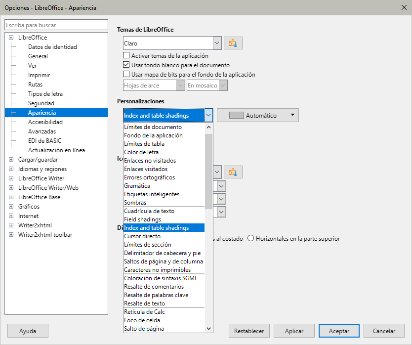 LibreOffice - Cadenas sin traducir en listado de personalizaciones (Apariencia ) writer