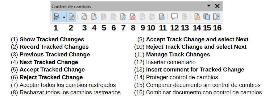 Y en las descripciones emergentes de los iconos de la barra de herramientas se puede ver esto: